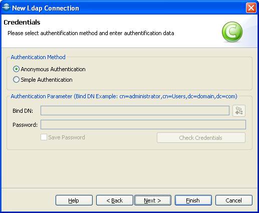 In the wizard's second page select the authentication method. If you choose the simple Authentication method also enter your bind DN or user and bind password. To check the authentication parameter you entered you may click to Check Credentials. Click Next when done.