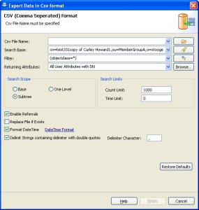 If you check this box the export process will surround the character containing delimiter with quotes for e.g cn=admin,cn=ldapsoft will be exported as "cn=admin,cn=ldapsoft" because the string contains "," delimiter. |