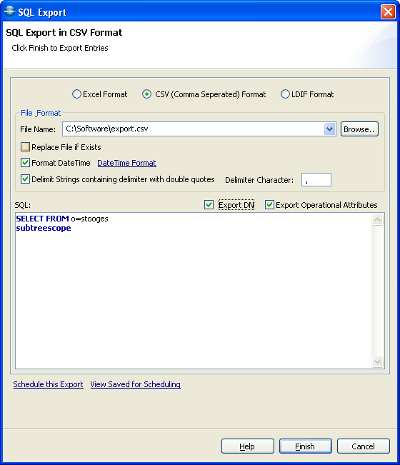To Export the data in csv, excel or ldif format just type the sql statement in the sql editor and click the Export Button. When you click the export button an export dialog will open displaying the current sql or you can type the sql directly in the export dialog