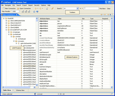 This topic provides a brief guide to the components of LDAP Admin Tool user interface. For detailed descriptions see below.